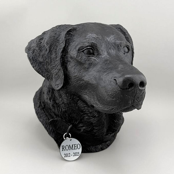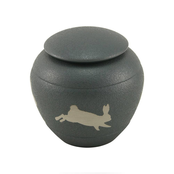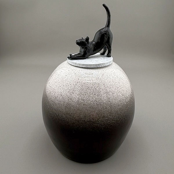 This charming hand-made ceramic urn features a hand-painted stretching black…