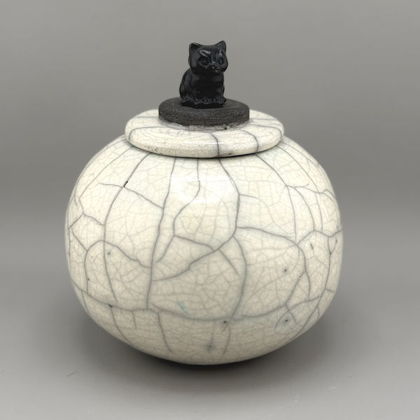 White Crackle Raku Pet Urn with Black Cat Figurine