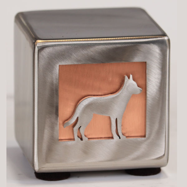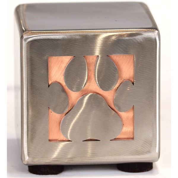 The Applewood Artisan Pet Urn showcases a silhouette in bright stainless steel offset by rich natural copper or treated copper (aqua green).
