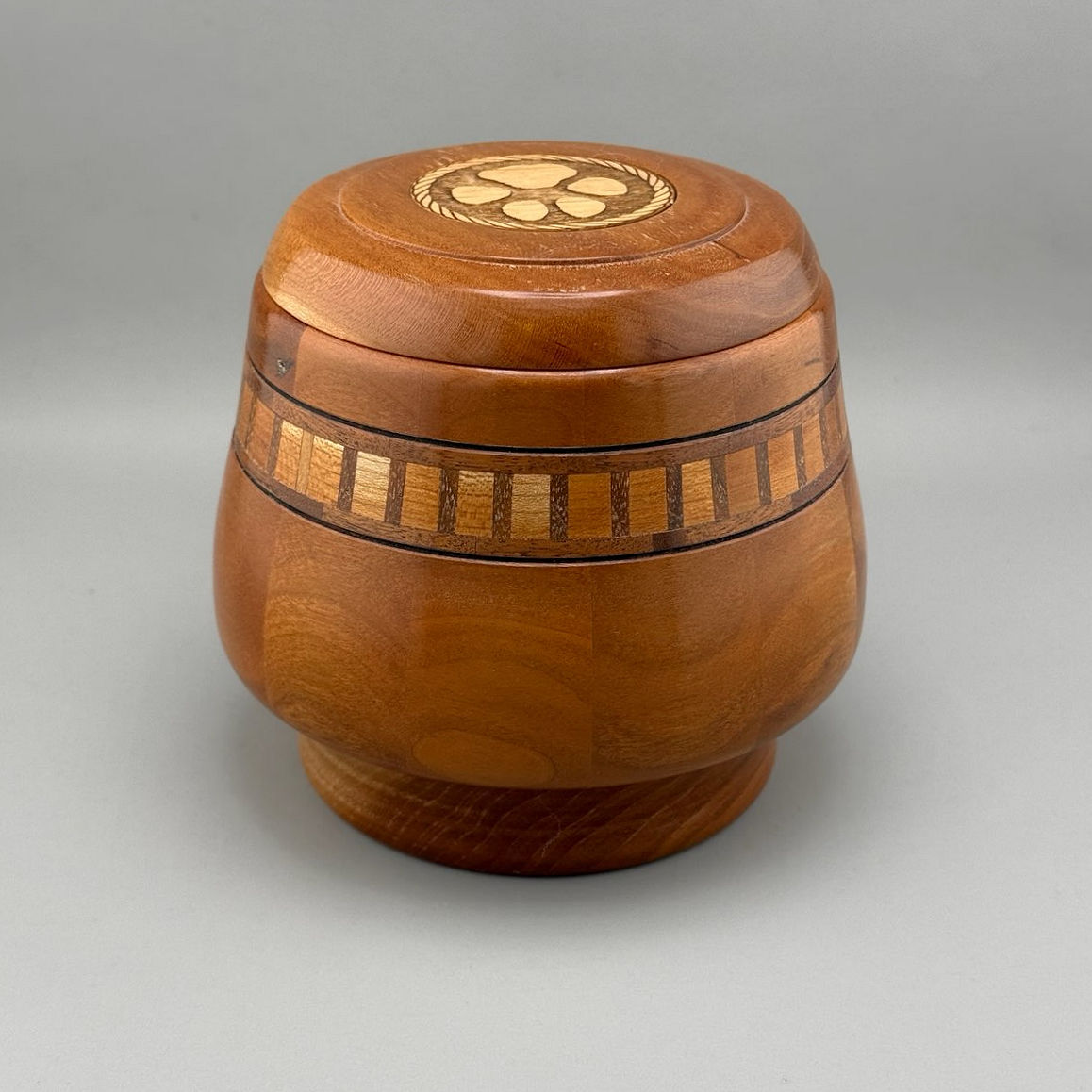 This gorgeous urn was made with care by a wood artist in Minnesota, USA. It is made from black cherry and walnut. Features a collar of pieced cherry framed by walnut. It also has an unusual sloped shape. This urn was created so that the grain of the wood is the star. This urn is not only attractive, but also a piece of wood art.