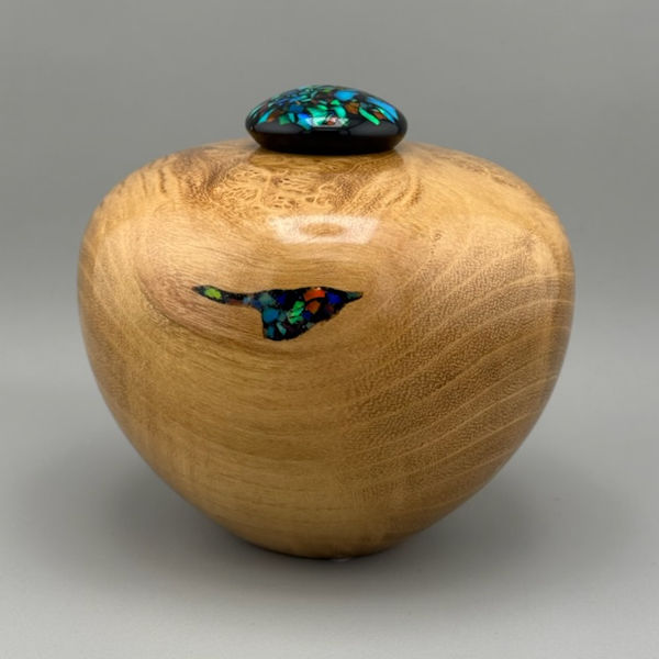 This spectacular urn was made from a gorgeous piece of black locust wood and turned on a wood lathe. Synthetic opal was inlayed into the natural inclusions to produce a gorgeous geode effect.