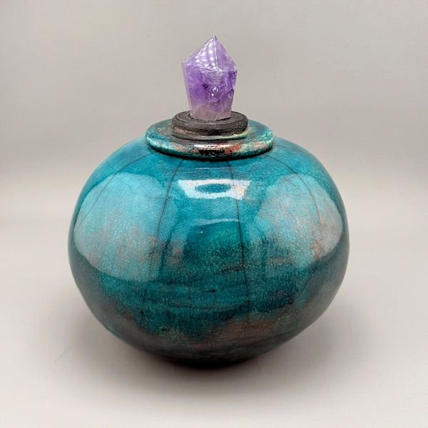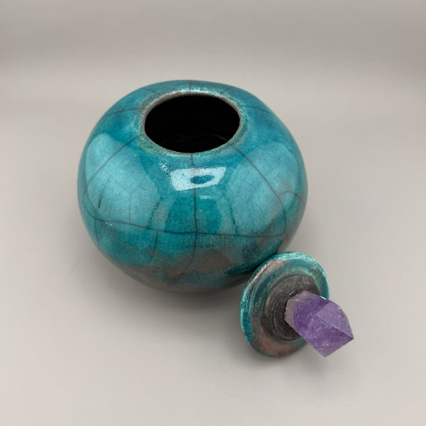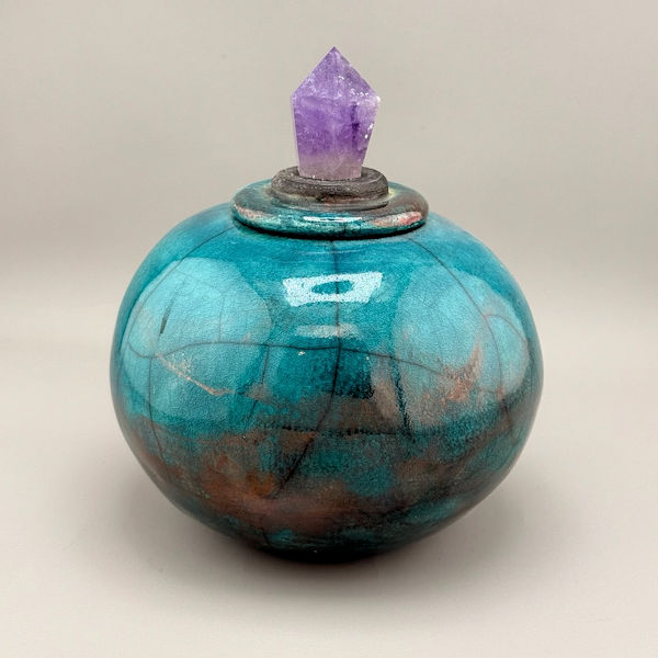 Simply gorgeous! This aqua blue and copper raku urn is topped with a lovely healing* amethyst handle. It is a special piece of original art that you will cherish as the resting place for your pet’s cremated remains.