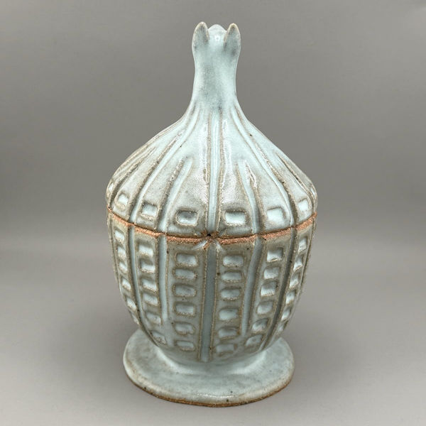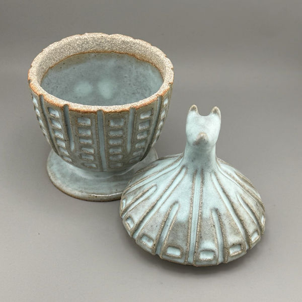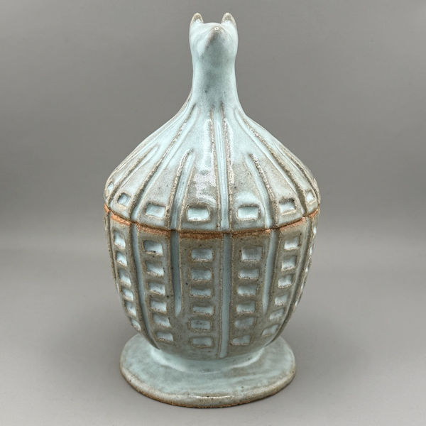 Additional Notes: This particular urn is a hand-made, coil-built urn. As she was building it, Sophie let her hands be guided by the profound knowledge which has been transmitted to us by dogs: we are all interconnected. Sophie, who is an animal chaplain, offers this note: “It was built slowly and with intention, infused with blessings to honor the sacredness of our interconnection with dogs and the world around us.” Once built, this urn was air-dried slowly and carefully to ensure it will not break. Then it was fired for a first time (a multi-day process), cooled, glazed with a chun (light blue-green) glaze, and fired again in a Cone 10 kiln for several more days.