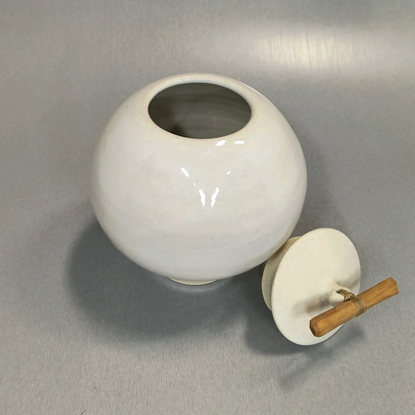 This urn was expertly shaped from white ceramic clay, kiln fired and finished with a high-gloss glaze. A hand-carved piece of local reclaimed wood makes a fitting handle.