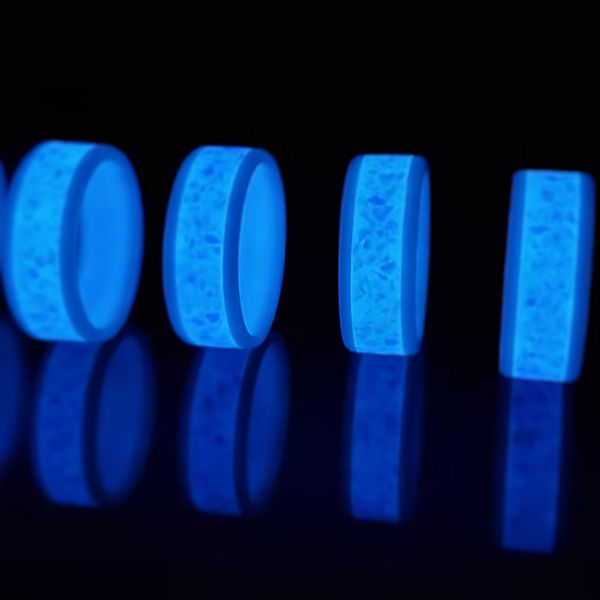 A small amount of your pet’s cremated remains, your choice of synthetic opal and a small amount of glow powder (blue, green, yellow or pink) are inlayed together into the center groove.
