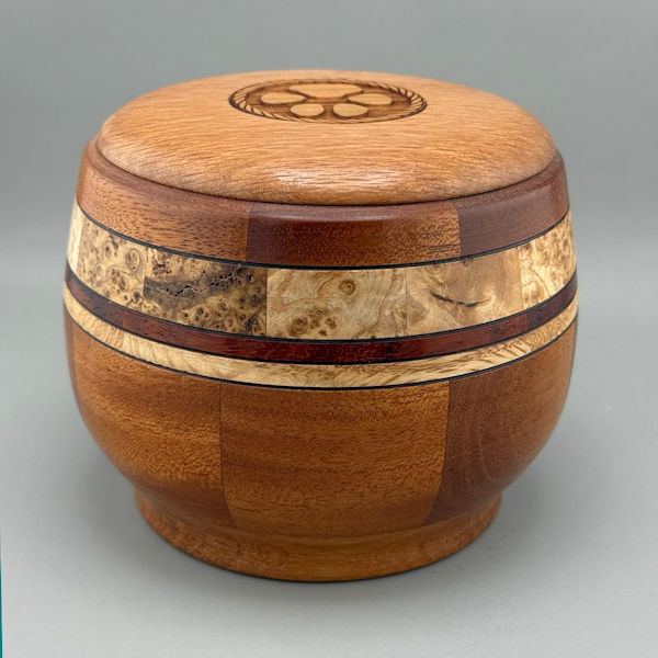 This gorgeous urn was made with care by a wood artist in Minnesota, USA. The body of the urn is made from mahogany, and the collar-like detail is burl wood and red paduk. This urn was created so that the grain of the wood is the star. It was made in the segmented wood art style where each piece is cut on a precise angle, glued, then turned on a lathe to shape. It is very strong. This urn is not only attractive, but also a piece of wood art.