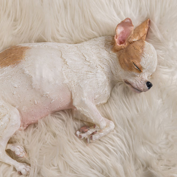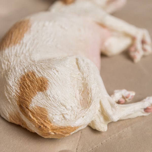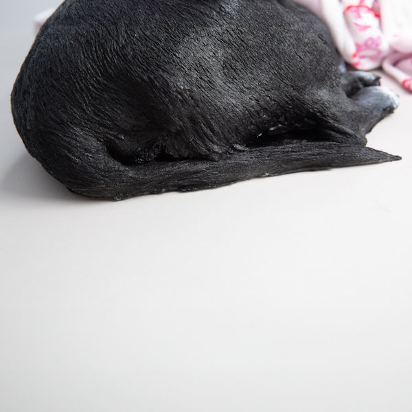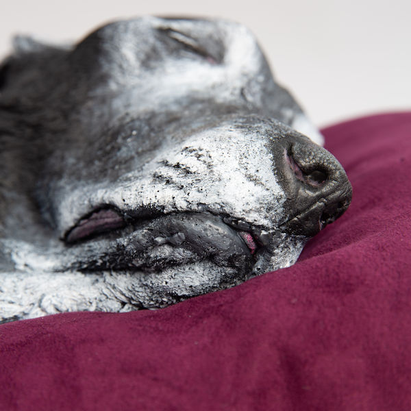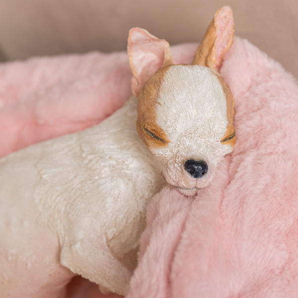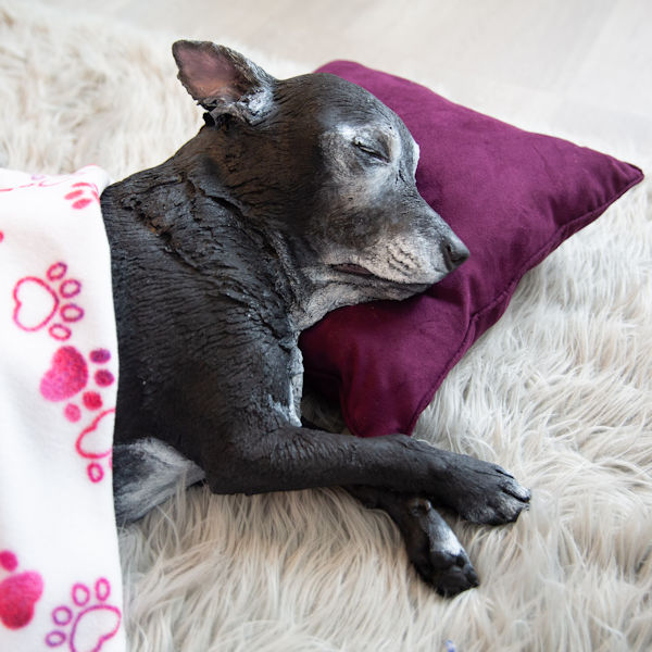 Your pet will be carefully posed to look as if they are sleeping. Silicone mold material is applied. The mold is then cast using a high-quality resin. The final casting is then painted by a talented local artist. Based on your choice of colors, a pet bed (or pillow) and blanket are custom made. The result is sculpture-like memorial.
