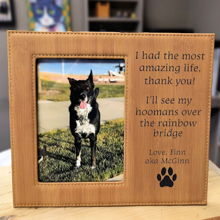 Happiness is…showcasing a favorite 5X7 photo of your beloved pet in a beautiful leatherette frame, engraved with your choice of text and image.