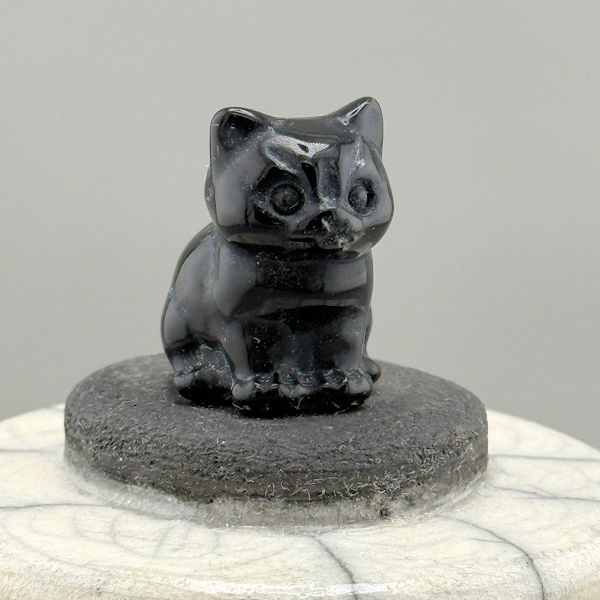 This white crackle raku urn is a cheeky little black cat figurine. It is a special piece of original art that you will cherish as the resting place for your feline’s cremated remains.
