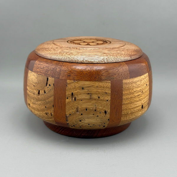 This wonderful urn was made with care by a wood artist in Minnesota, USA. The body of the urn is made from wormy butternut — carved by nature. Mahogany detail added for color. The wood grain and worm holes make this urn extra special. This urn is not only attractive, but it is a piece of art and a conversation piece.