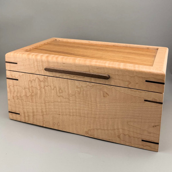This extra-large chest-style urn in tiger maple and sapele woods…